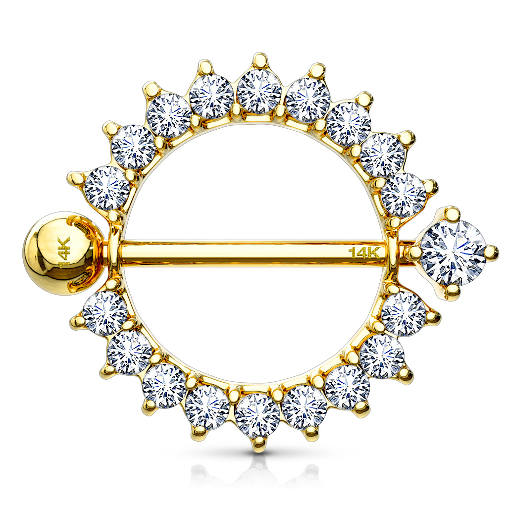 Mangler du et eksklusivt brystsmykke til din brystpiercing? Da har du nå muligheten til å pynte ditt bryst med et smykke laget av ekte 14 karat gull, med flotte klare stener hele veien rundt skjoldets kant. Smykket er designet så det ligner en liten sol hvor alle de glitrende vakre stenene skinner om kapp med hverandre. Hver enkel sten er direkte innfattet i gullet og er altså ikke limt fast.