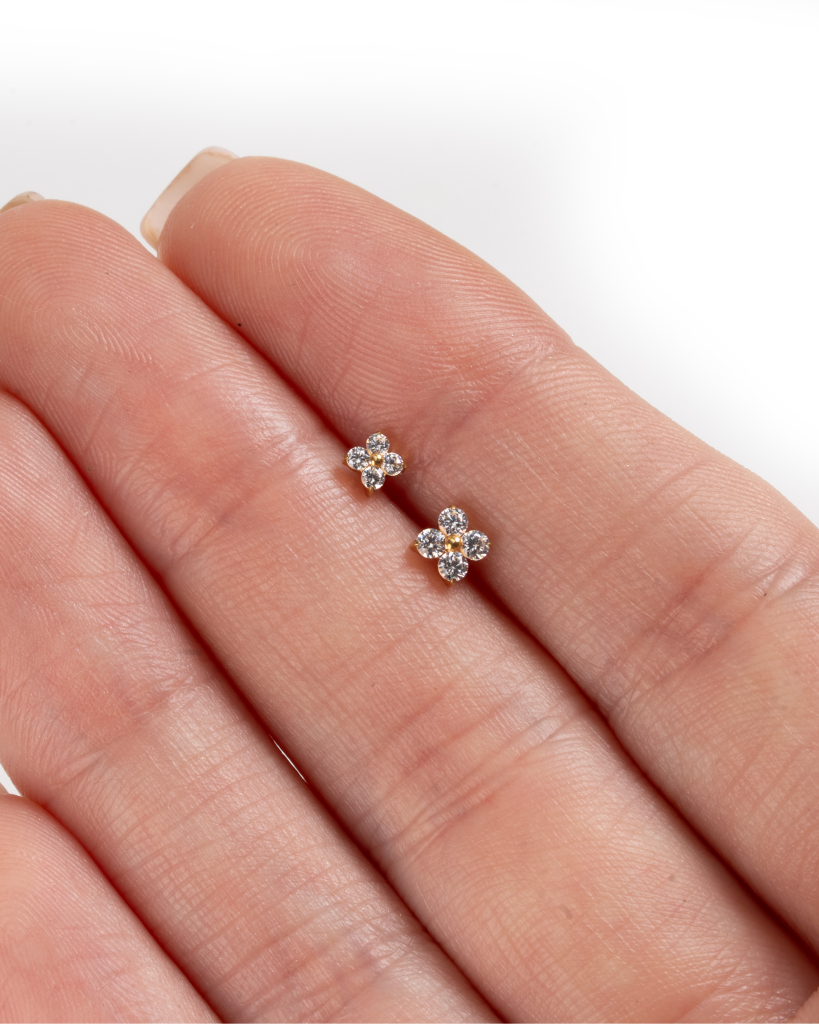 Den lille, titanbaserte blomsterlabreten i miniatyr gir et mykt, blomsteraktig preg med små steiner formet som en blomst. Steinene er presist innfattet og sitter tett mot huden, noe som gir et lett og delikat uttrykk uten å føles tungt. Den finnes i gull og sølv, og i to størrelser: den minste for et diskret uttrykk, og den største for litt mer fremtreden. Bruker du begge sammen, får du et helhetlig og gjennomtenkt uttrykk.