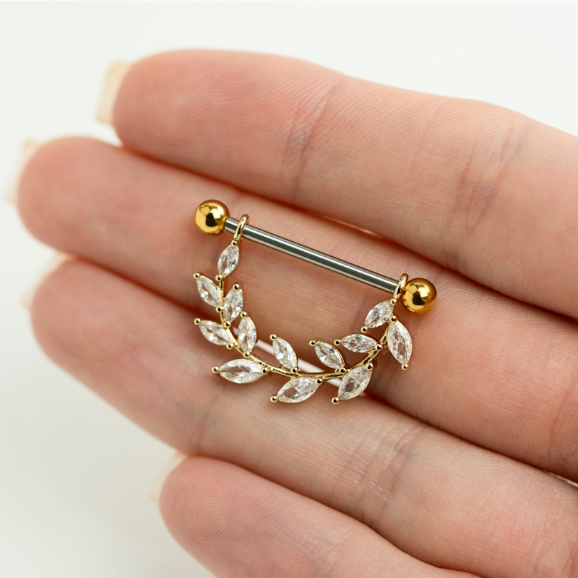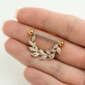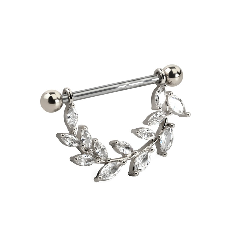 Dette brystsmykket er perfekt til deg som foretrekker de litt mer feminine design. Smykket her består av en rett stav, slik man normalt kjenner en piercingstav - Med en kule i hver ende. Kulerne kan skrues av (og skiftes ut, hvis man har lyst til det). På staven henger det et anheng, som i all sin enkelhet består av små marquise slepne stener som tilsammen danner designet som forestiller små blader. Stenene henger som blader på en gren, hvor de er festet i hver ende av bladet.