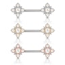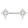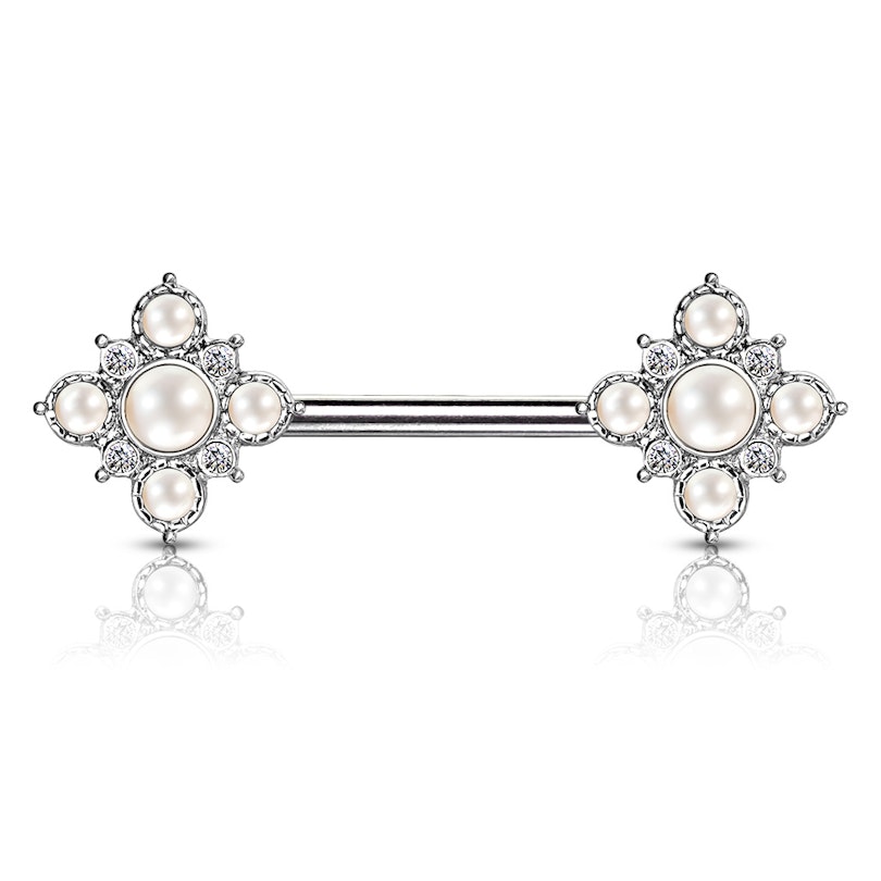 Smykket du ser over er til deg med en bryst piercing - Eller en piercing i hvert bryst. Kort sagt består smykket av en stang av kirurgisk stål. Den måler mellom blomstene ca. ca. 12 mm. Om det er blomster eller ikke, overlater vi til deg å bestemme, men med litt fantasi kan du godt se den store perlen som sentrum av blomsten og de fire mindre perlene som blomsterbladene. Mellom bladene finner du 4 små krystaller som gir et godt spill for helheten.
