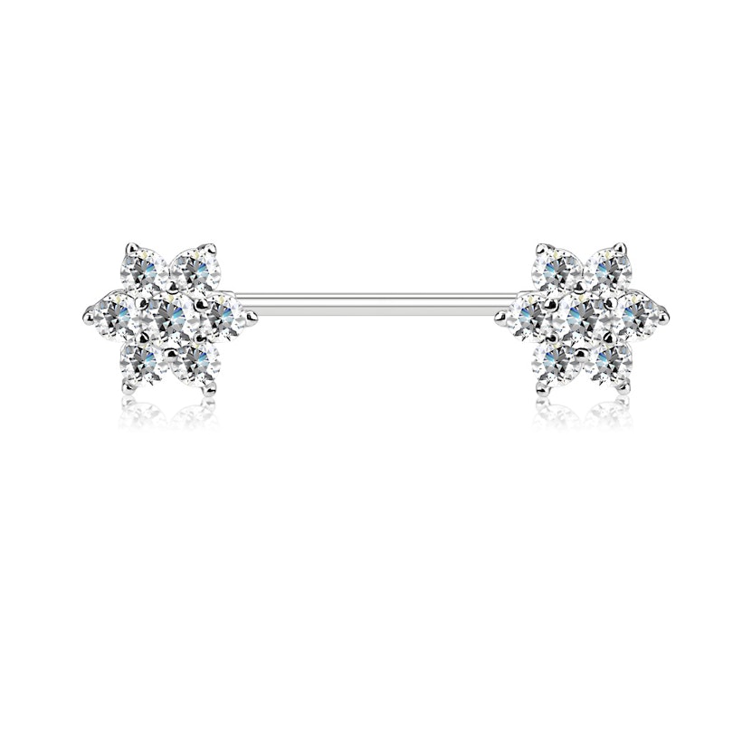 Superfin og elegnt brystpiercing med den fineste glimtende blomst på begge sider av staven.