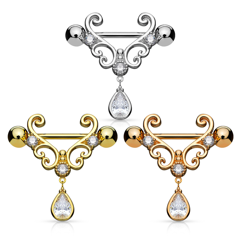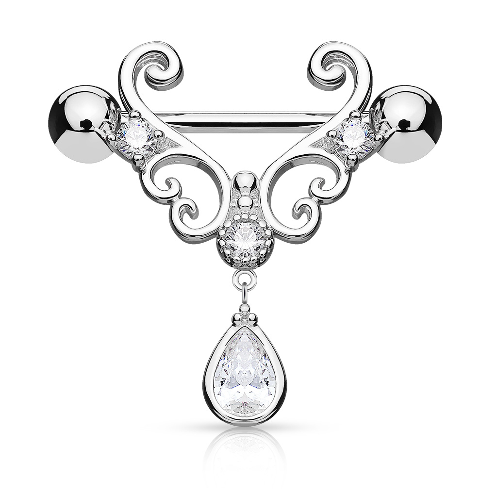 Men når smykket først har funnet sin rette eier og det sitter på sin plass, blir det nok heller ikke smukkere, når smykket med sine hjertelignende vridninger omkranser ens brystvorte. Hjertet er brutt i toppen, hvor hjertets ender folder seg innover. Følger man hjertet ned langs kanten støter man på hver side på to små klare stener som sitter likeved siden av enda to hjerter. I bunnen av det store hjertet er det også plassert en sten, hvorfra det via et bindeledd henger enda en sten, som prikken over i'en. Stenen i anhenget er dessuten dråpeformet, så det ser ut som om det faller en dråpe fra hjertet.