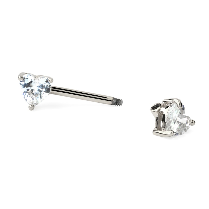 Den ene hjerteformede stenen kan skrues av, så smykket fort og enkelt kan settes i, hvoretter stenen skrues på igjen. Smykket har en trådtykkelse på 1,6 mm. og en lengde på 12. mm. Det vil si at den eneste valgmuligheten du har er fargen, målene på smykket er likt for alle modellene.