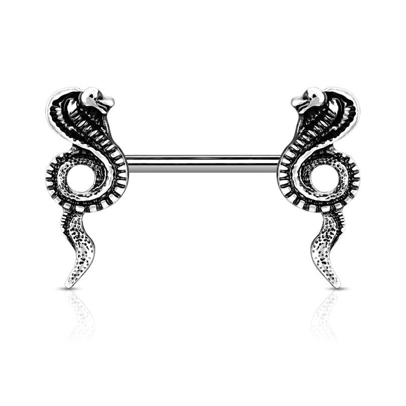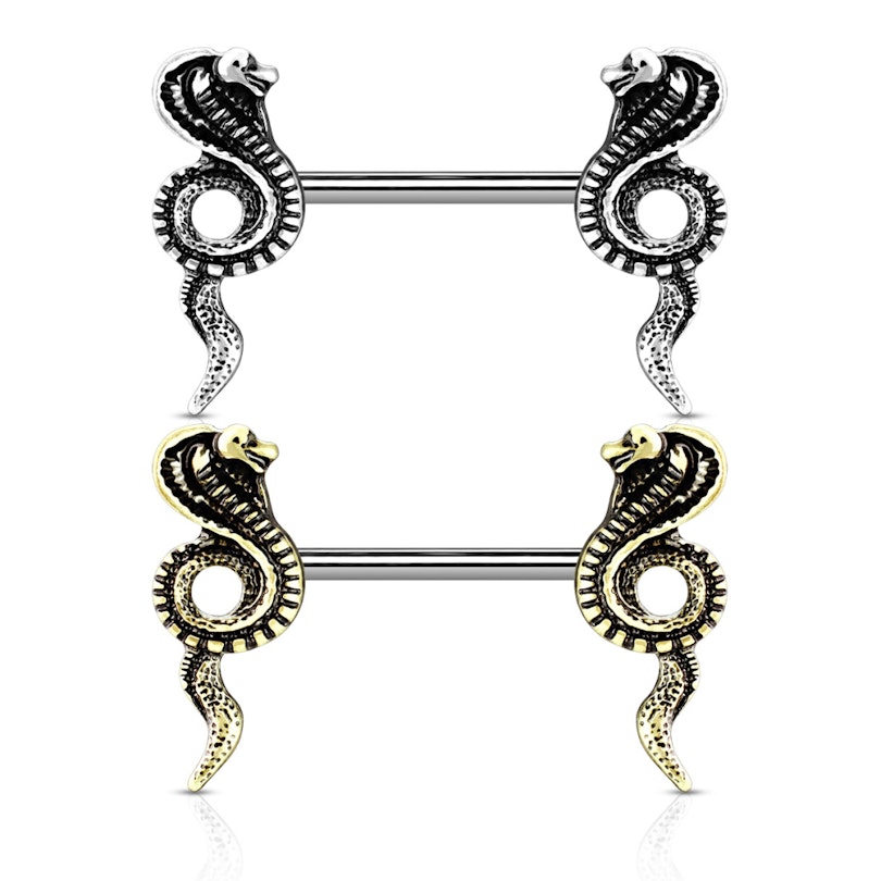 Smykket her består va en stav på 14 mm. og 1,6 mm i trådtykkelsen. I hver ende sitter det en vridd kobraslange. Slangene er symmetriske så de har fronten mot hverandre og det samme gjelder krøllen på kroppen. Slangene måler ca 20 mm i høyden.