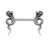 Smykket her ligner kanskje ikke på de smykkene som du er vandt til å se. Allsidige smykker består ofte bare av en stav med en kule i hver ende. Men så snart smykkene blir laget til spesifikke piercinger, kan man også leke ltt med kreativiteten, som det er gjort her. Smykket er nemlig beregnet for bruk i brystet - og umiddelbart også kun der. Smykkets utforming gjør det vanskelig å bruke det andre steder f.esk i tungen.
