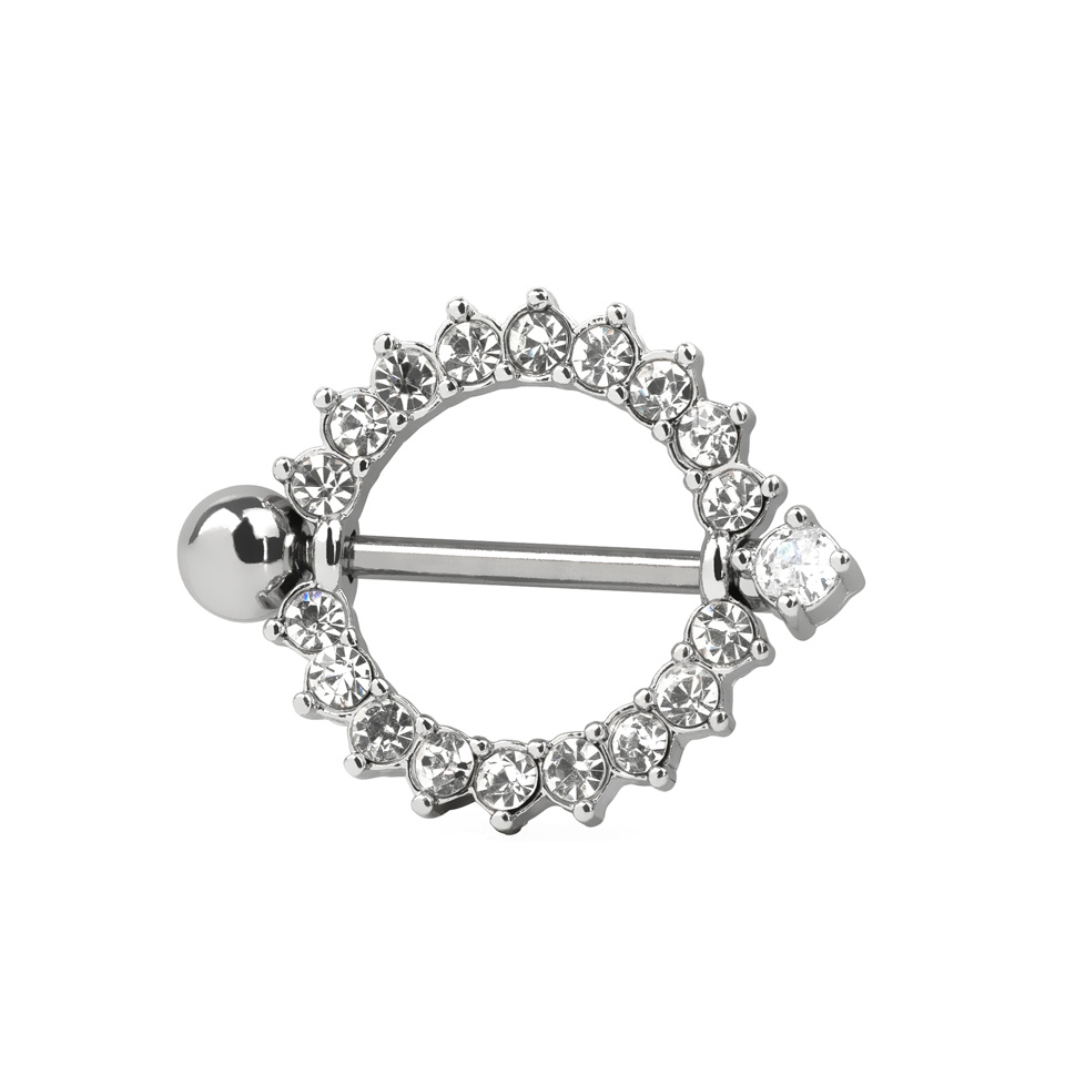 Her ser du en vakker og stilfull brystpiercing med rundt skjold og diamantlignende klare stener som pynter hele smykkets kant, det er i sannhet et smykke som er enhver gudinne verdig. Dekorer ditt bryst med dette fantastisk flotte brystskjoldet og du vil føle det som om du var selveste Cleopatra.