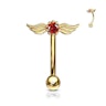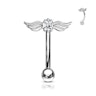 Barbellen du ser på bildet over er en buet stav og er velegnet i øyebrynet. Staven er 8 mm lang of 1,2 mm tykk. I bunnen av staven sitten en 3 mm stor kule som kan skrus av og på. I toppen av staven er dett ikke noen kule som man normalt ser. Isteden for er det et sett med englevinger som strekker sig til hver sin side. I midten av vingene sitten en flott sten, som alt etter ditt valg av materialfarge også er forskjellig.