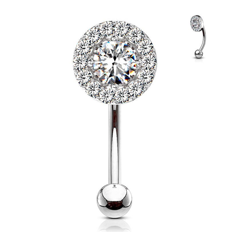 Med denne buede staven får du et smykket som er meget iøyefallende med sin store funklende sten, som du også selv kan velge fargen på. Stenen sitter på en rund plate av messing som er belagt for å matche staven den sitter på. Stenen kan du som sagt selv velge fargen på, den kommer blant annet med en turkis sten. Ta en titt i boksen for å se fargeutvalget på stenen. Utover stenen, så sitter det også en masse klare stener rundt den - disse stenene vil alltid være klare.