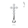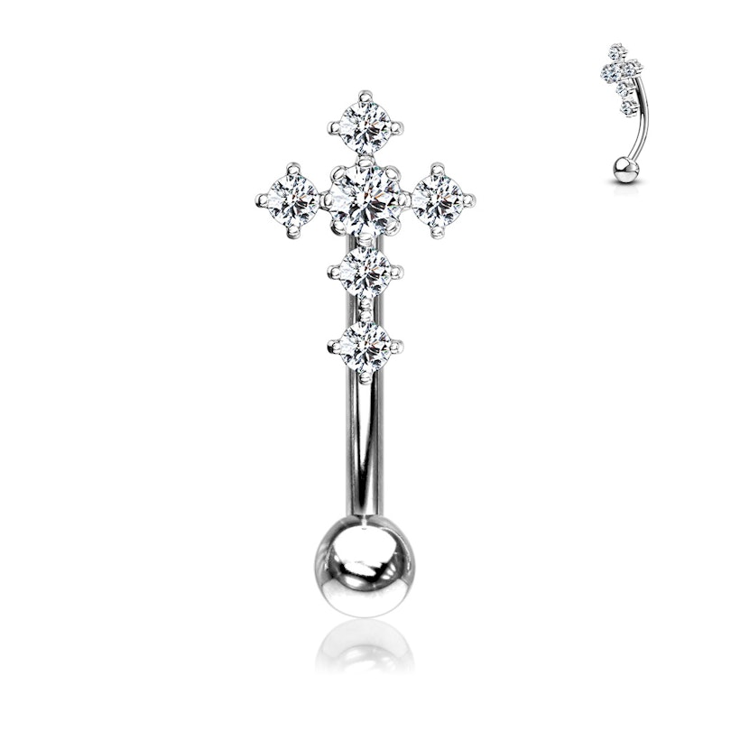 Denne buete staven er laget av kirurgisk stål og kan velges i tre flotte materialfarger. Fargene som er brukt kommer hendholdsvis fra rhodium for den blanke og 14 karat gull for de to andre. Det er utelukkende fargen som er forskjellen på smykkene - Både mål og stenfarger er identiske. Stenene som du ser i toppen av smykket danner tilsammen et kors. Det er en sten i toppen, en på hver side, to i bunnen og en litt større sten i midten. Alle stenene er runde og sitter fast ved hjeld av fangarmer.