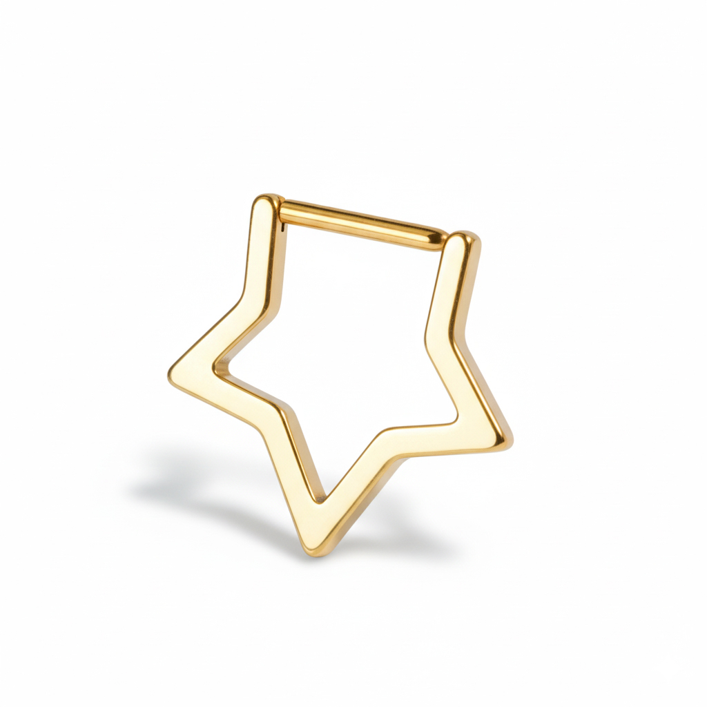 Denne stjerneformede clickerringen i titan passer perfekt for flere typer piercinger. For eksempel vil den se flott ut som septum-, helix-, øreflipp- eller rookpiercinger. Den er laget av titan som er et slitesterkt og vanntett materiale, og ikke minst er smykket hudvennlig og laget for å vare. Hengselet som åpner det gjør prosessen med å sette ringen i piercingen enkel. Smykket er faktisk hult, noe som gir den et solid utseende samtidig som den er superlett og behagelig å ha på seg.