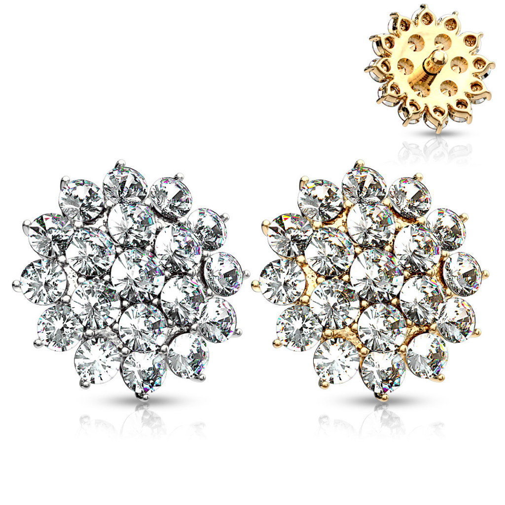 Her finner du et smykke som helt sikkert vil kle din dermal base, hvor den kan få sitte og glitre i all sin glans. Denne dermalen er formet som en blomst, og den har fått påsatt en hel masse klare stener som gir smykket sin glød. Stenene sitter fast ved hjelp av bittesmå fangarmer som stikker opp og holder fast rundt hver sten - derved holdes stenene på sin plass.