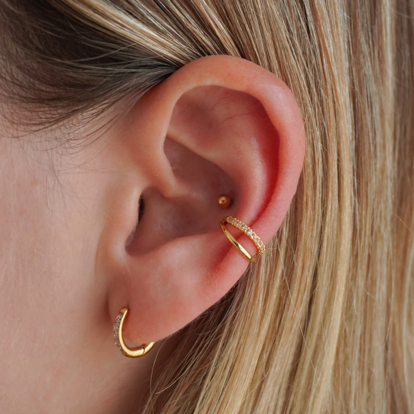 Den doble earcuffen med CZ-stener er en lettvint måte å legge til detaljer for looken uten å gå for en ekte piercing. Den er designet for å sitte tett på øret og gir inntrykk av man har to piercinger, samtidig som den er behagelig nok til hverdagsbruk. De små kubiske zirkoniastenene sitter pent i rekke i klorfatning og gir akkurat nok med detaljer Kommer i gull- og sølvfarge.