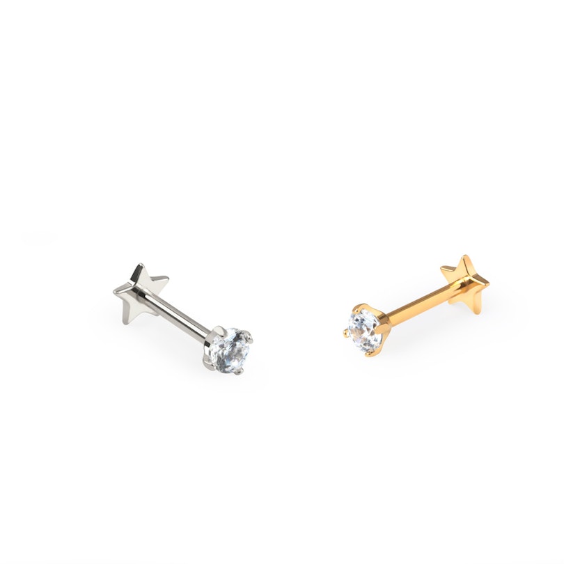 Denne titanlabreten har en flat stjerneformet bakside, og er perfekt for piercinger som øreflipp- eller helixpiercinger der baksiden er av smykket er synlig.