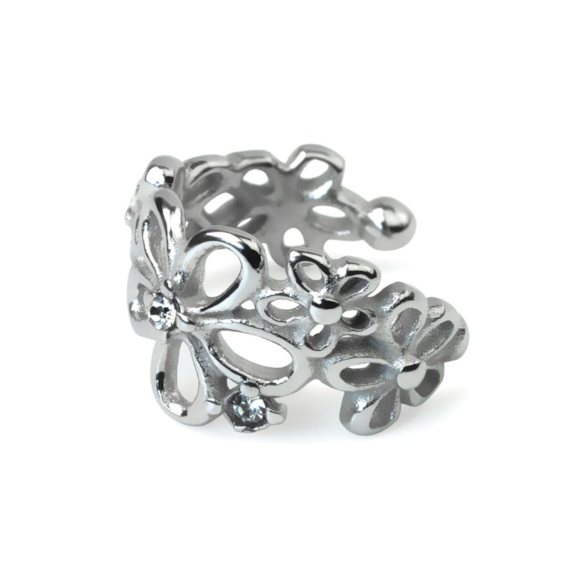 Denne delikate earcuffen har enkle og delikate blomster i forskjellige størrelser som plasseres rundt øret. På midten av de større blomstene er det små stener som gir dette smykket en vakker glans. Endene på smykket har små kuler som gjør det behagelig å ha på seg. Materialet rustfritt stå har den fordelen at smykket ikke vil danne belegg eller misfarge huden din. Et flott smykke pryde øret ditt uten behov for en ekstra piercing.