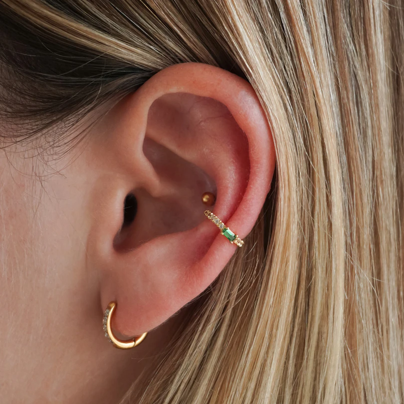 En grønn fargeklatt kan forandre hele utessende. Denne earcuffen har en enkel grønn sten som tilfører farge uten å gjøre det for dominant, og gjør det enkelt å tilføye looken med noe litt uventet til slutt.