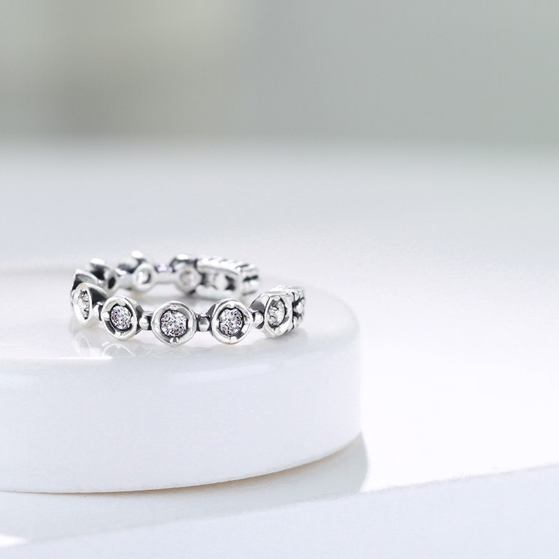 Det sitter også 9 små klare stener i smykket, som alle er innfattet i selve smykket. Stenene er plassert i en halvsirkel som går fra den ene enden av smykket til den andre. I alt måler hver av de små stenene 1,5 mm. i diameter, hvilket gjør at de er ganske små og diskret. Men de kan fortsatt fange oppmerksomheten til folk når lyset treffer dem og de begynner å glitre.