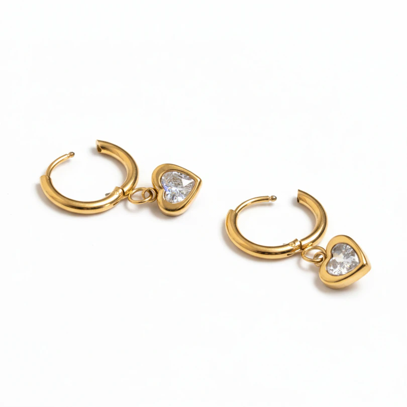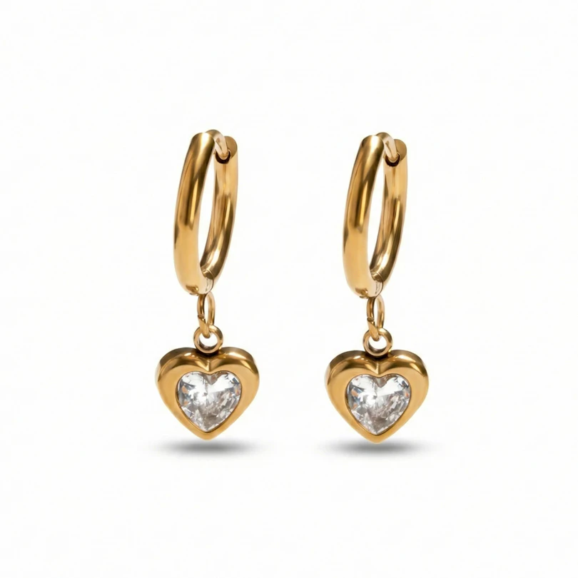 Et par åpne ringer med hengende hjerte som gir en leken vri på hverdagslooken. Hver den åpne ringen finner vi et lite hjerteanheng som dingler når du beveger deg. De har hengsellås og er enkle å ta på og av, perfekt når dagsplaner blir til turer ut på byen. Kommer i gull og sølv.