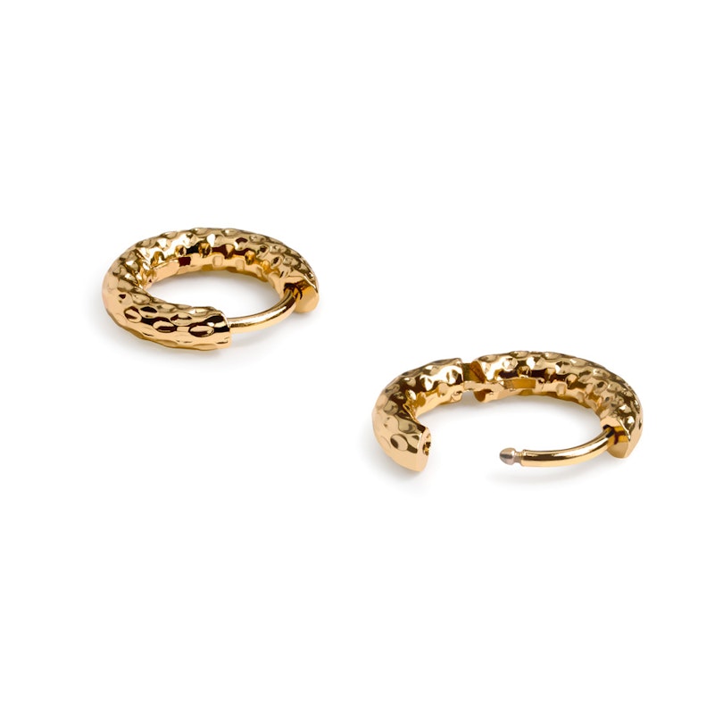 Klar for å friske opp looken din? Disse øreringene med hamret effekt vil fort bli en favoritt. Perfekt for øreflippen og ideelle som base når du vil kombinere flere smykker. Den hengslede lukkemekanismen gjør dem både enkle å ta på, og er sikre. En Naturlig stil helt uten bryderi.