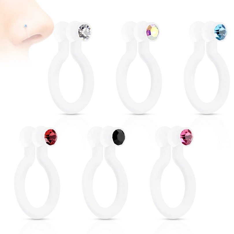 Nå kan du få den skjønneste fake nesepiercingen med en enkel og diskre liten sten i, helt uten å være piercet i nesen. Dette flotte smykket ligner en liten klar ring av ptfe, som er et klart og bløtt plastmateriale med en sten der den går “inn i” nesen. I virkeligheten er det bare en bøyle som settes opp rundt nesen, hvor den presses sammen fra hver sin side så den sitter i spenn rundt neseboret.