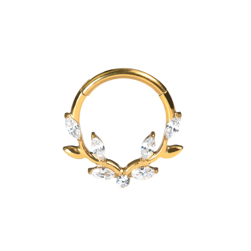 Denne førstklasses fomovervendte klikker-ringen med et vakkert vinbladdesign, passer perfekt til piercinger som daith og septum. Den er laget av titan, noe som gjør den både slitesterk og allergivennlig. Et flott tillegg til samling din.