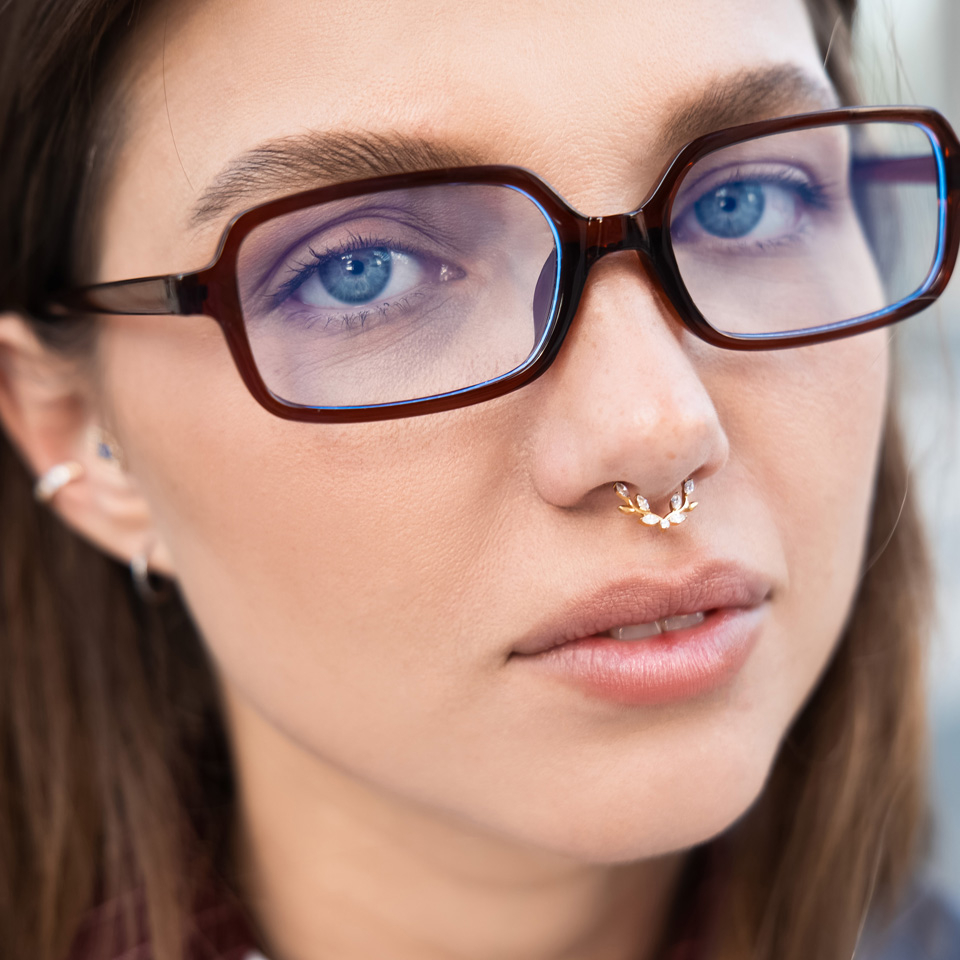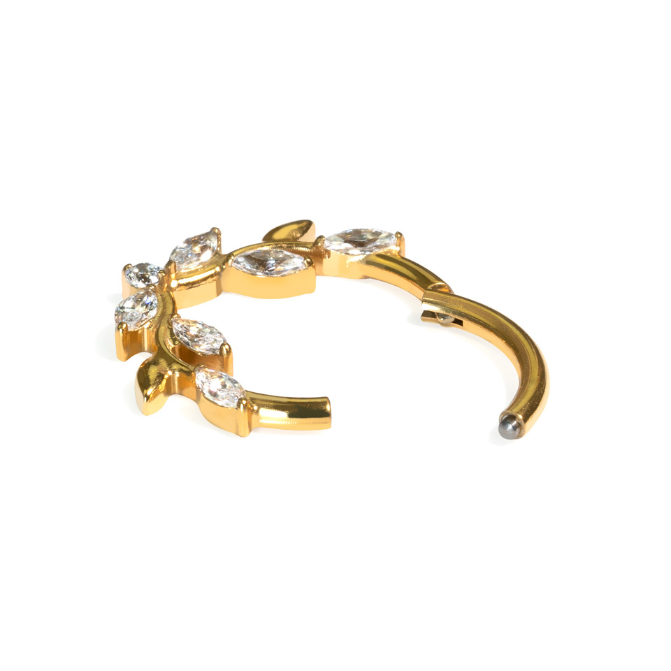 Denne førstklasses fomovervendte klikker-ringen med et vakkert vinbladdesign, passer perfekt til piercinger som daith og septum. Den er laget av titan, noe som gjør den både slitesterk og allergivennlig. Et flott tillegg til samling din.