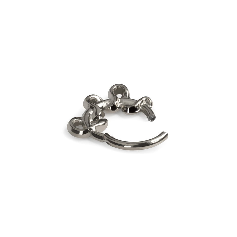 Denne forovervendte, hengslede ringen med slangemotiv vil ta seg ut i flere typer piercinger, inkludert septum, conch, daith og rook. Den er laget a kirurgisk stål, er vantett og passer for de fleste hudtyper. Den hengslede lukkemekanismen gjør den enkel å sette inn og sikre piercingen på plass.