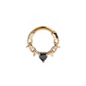 Denne forovervendte ringen har en piggtrå-design med en svart, hjerteformet sten i midten, Den er utstyrt med hengsel, noe som gjør den enkel å fete i piercingen.