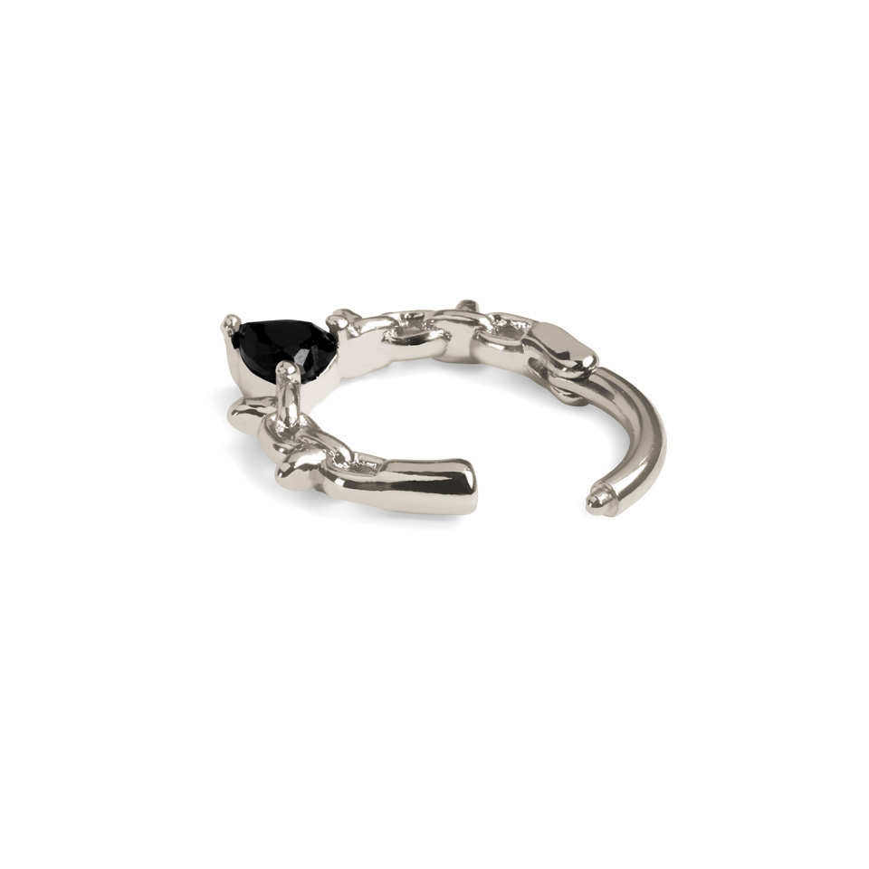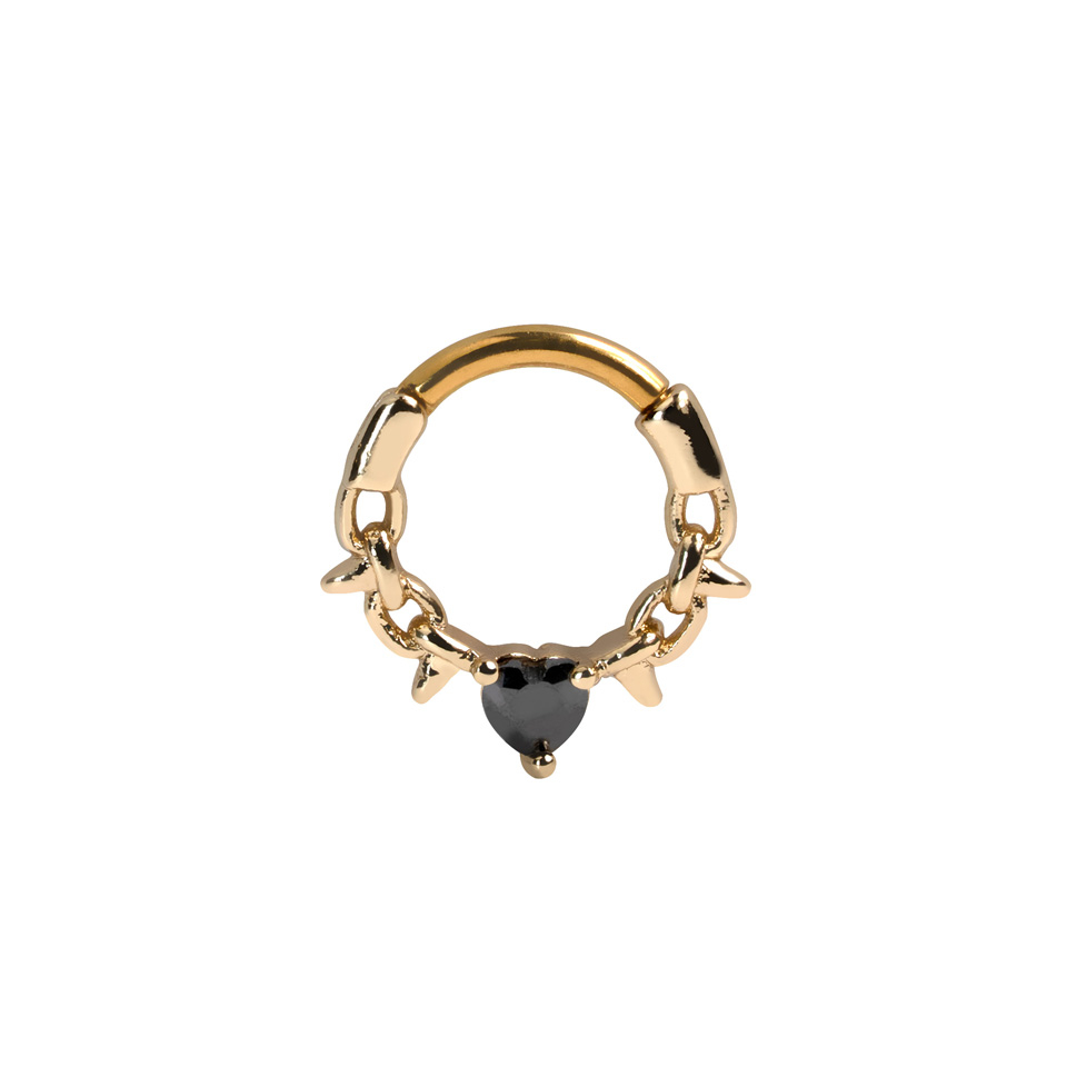 Denne forovervendte ringen har en piggtrå-design med en svart, hjerteformet sten i midten, Den er utstyrt med hengsel, noe som gjør den enkel å fete i piercingen.