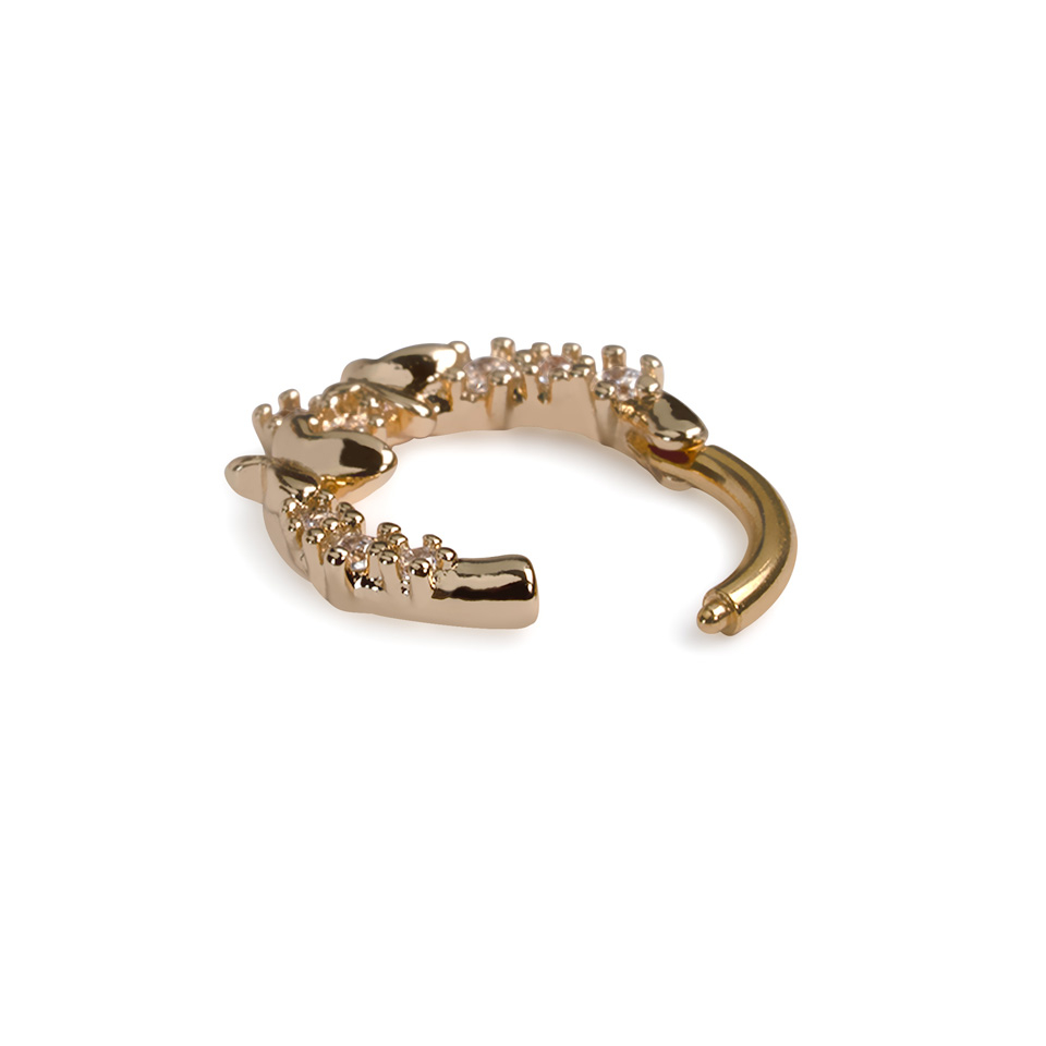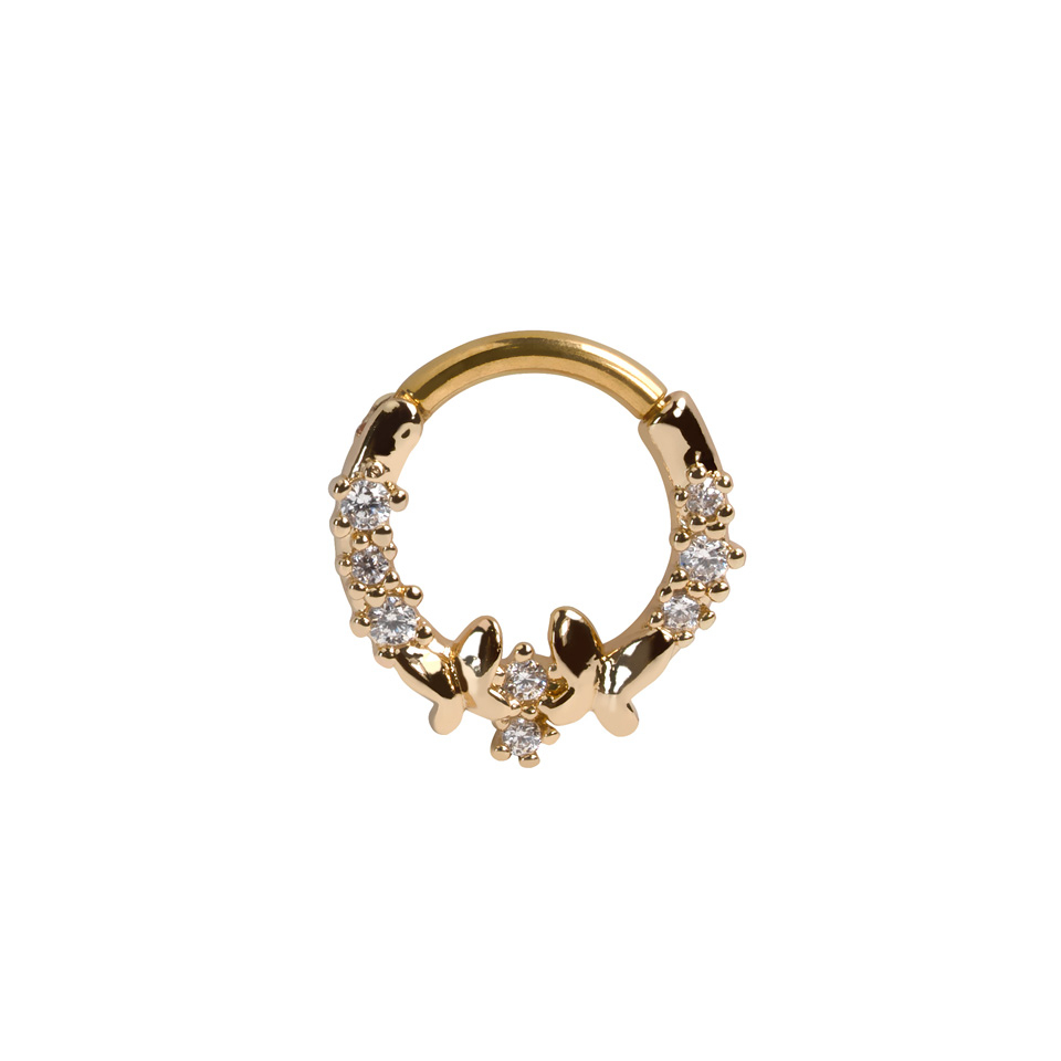 Denne søte forovervendte ringen med sommerfugler er omringet av små CZ-stener- Den er hengslet noe som gjør det enkelt å sikre piercingen på plass.