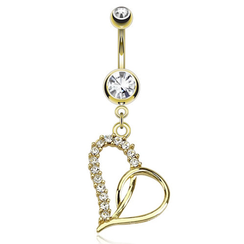 Her har du et vakkert og ytterst elegant hjerte i et helt unikt design, som vil få enhver pikenavle til å lyse langt vekk av feminin skjønnhet. Navlepiercingen her er belagt med et tynt lag ekte 14 karat bladgull. Staven har en standardlengde på 10 mm. og både topp -og bunnkule er dekorert med en flott klar sten, som matcher de klare stenene i anhenget.