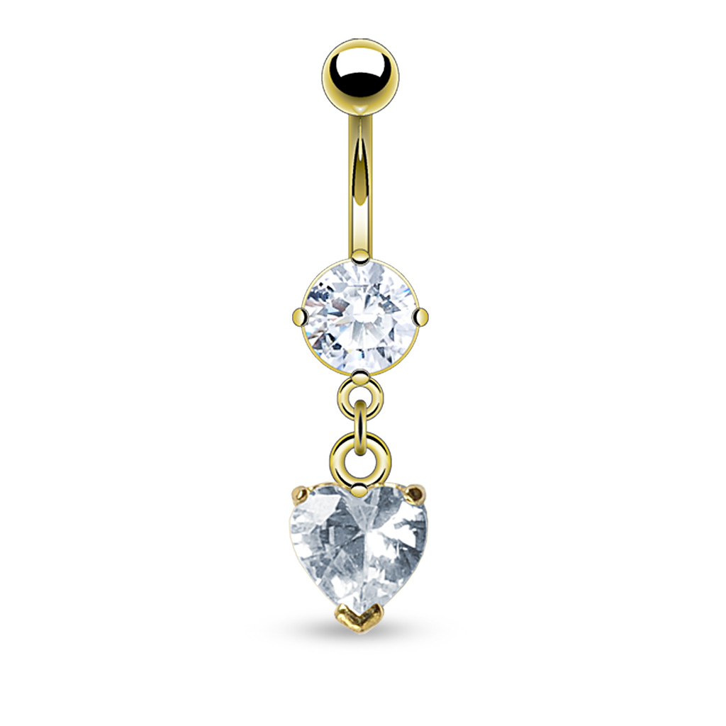 Gullbelagt navlepiercing med stener og hjerteformet anheng