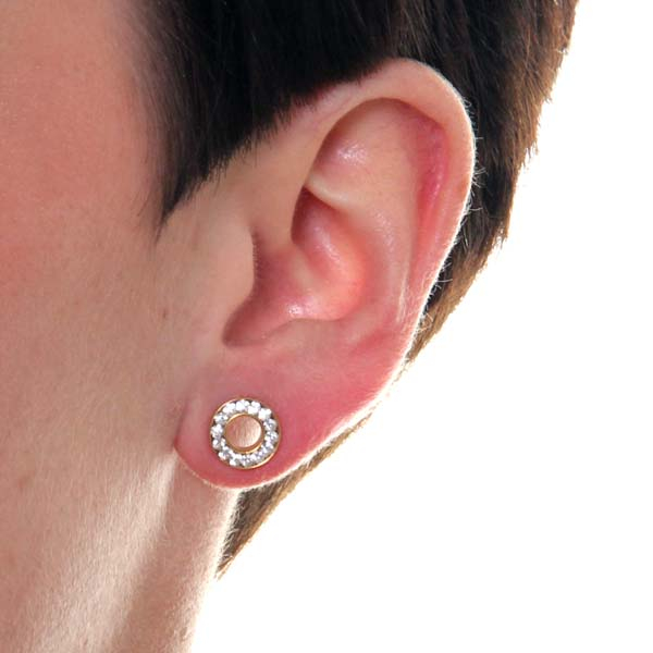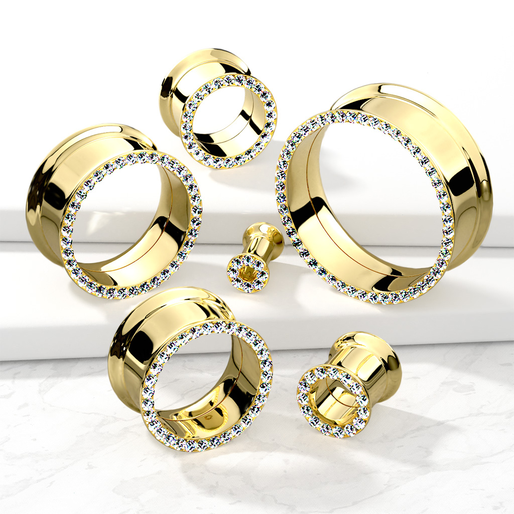 Denne tunnel er laget av gullbelagt kirurgisk stål og er pyntet med små klare stener rundt hele kanten.