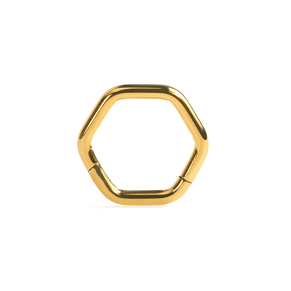 Denne heksagonale hengslede ringen i titan er et allsidig smykke som kan brukes i mange typer piercinger, inkludert helix, øreflipp og daith. Den tar seg også flott ut som nostrilpiercing, Fordi den er laget av titan, er den både allergivennlig og vanntett, og det enkle designet gjør den ypperlig for hverdagsbruk.