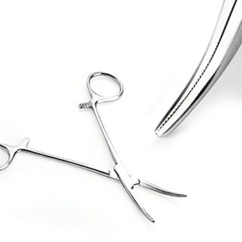 Dette hemostatiske verktøyet med en buet ende måler 14 cm i lengde. Det har en tretrinns låsemekanisme og er laget av rustfritt stål, slik at det kan steriliseres i autoklav. De er et viktig verktøy for enhver profesjonell piercer .