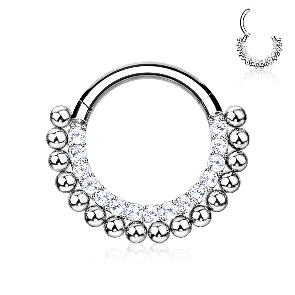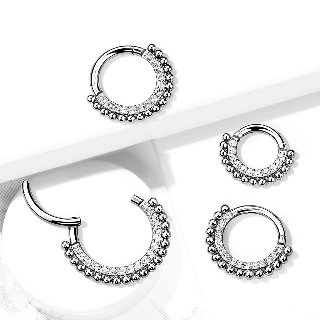 Titan er et av det beste materialet du kan ha i piercingen din. Av den grunn bruker man materialet titan når du blir piercet for første gang. Vanligvis er titansmykker kjedelige. Dvs. uten steiner og ornamenter på. Det gjør dette smykket mer spennende med sine mange stener og de små runde kulene på ytterkanten av denne ringen.