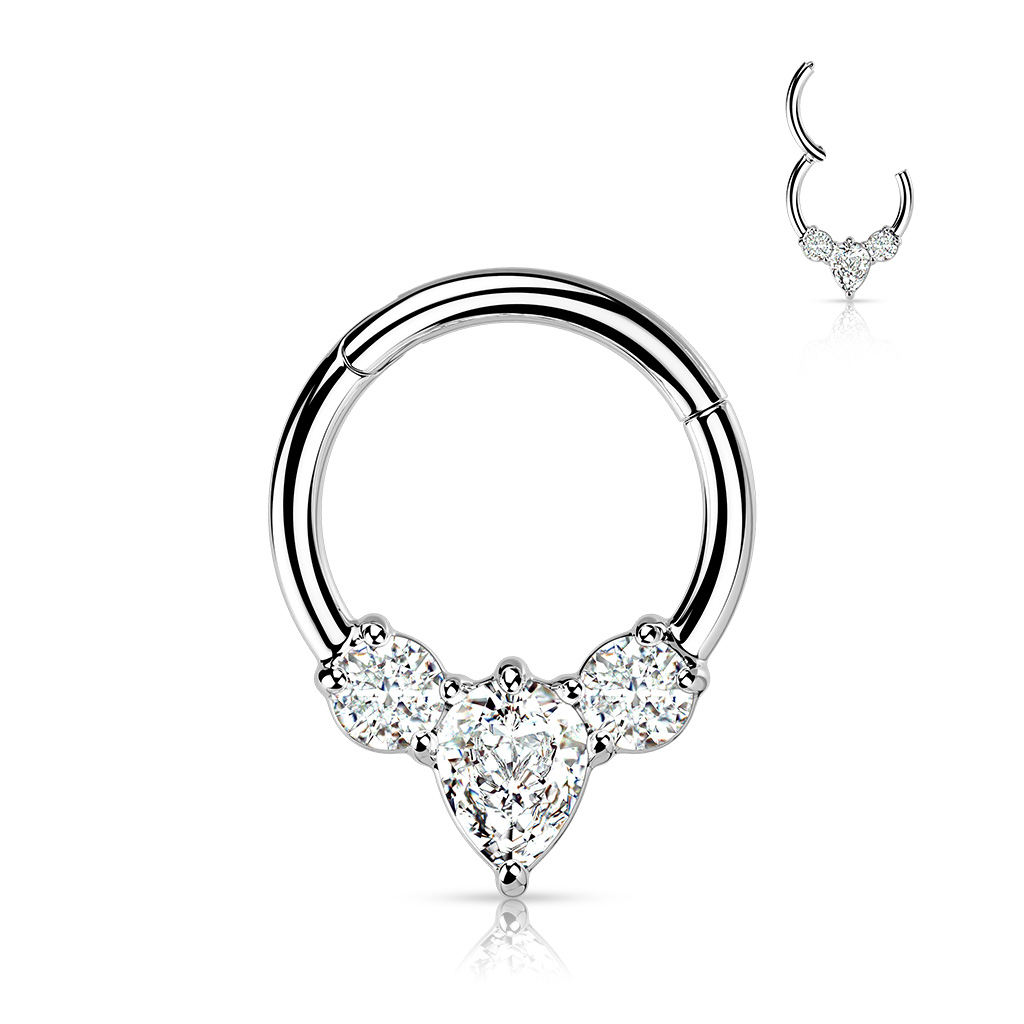 Hengslet ring i kirurgisk stål med pæreformet sten i midten
