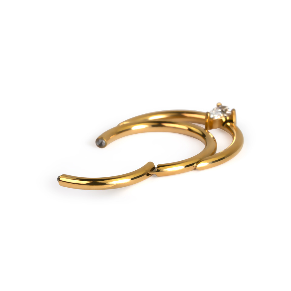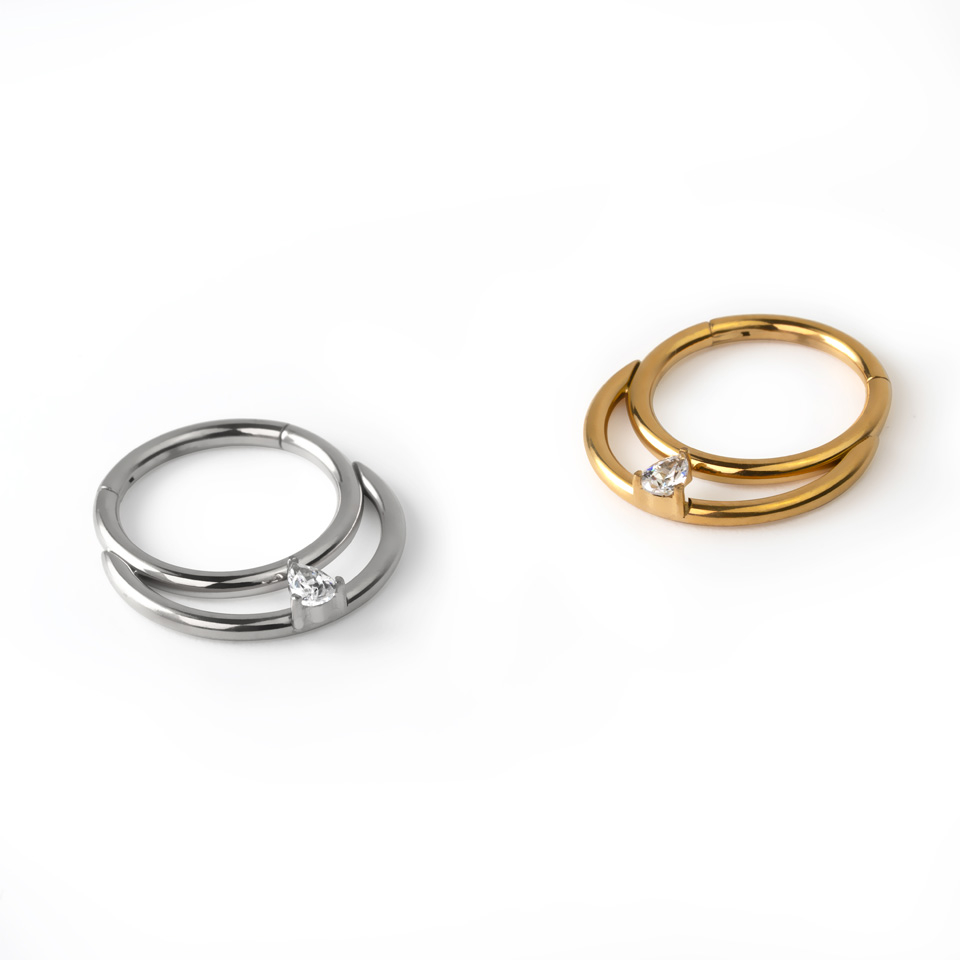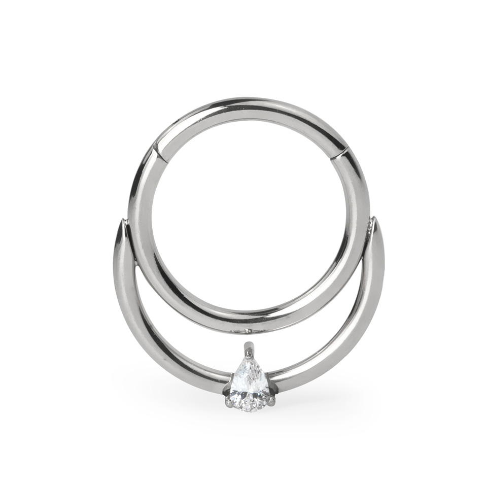 Navn: Hengslet ring i titan med dobbel bøyle og dråpesten
