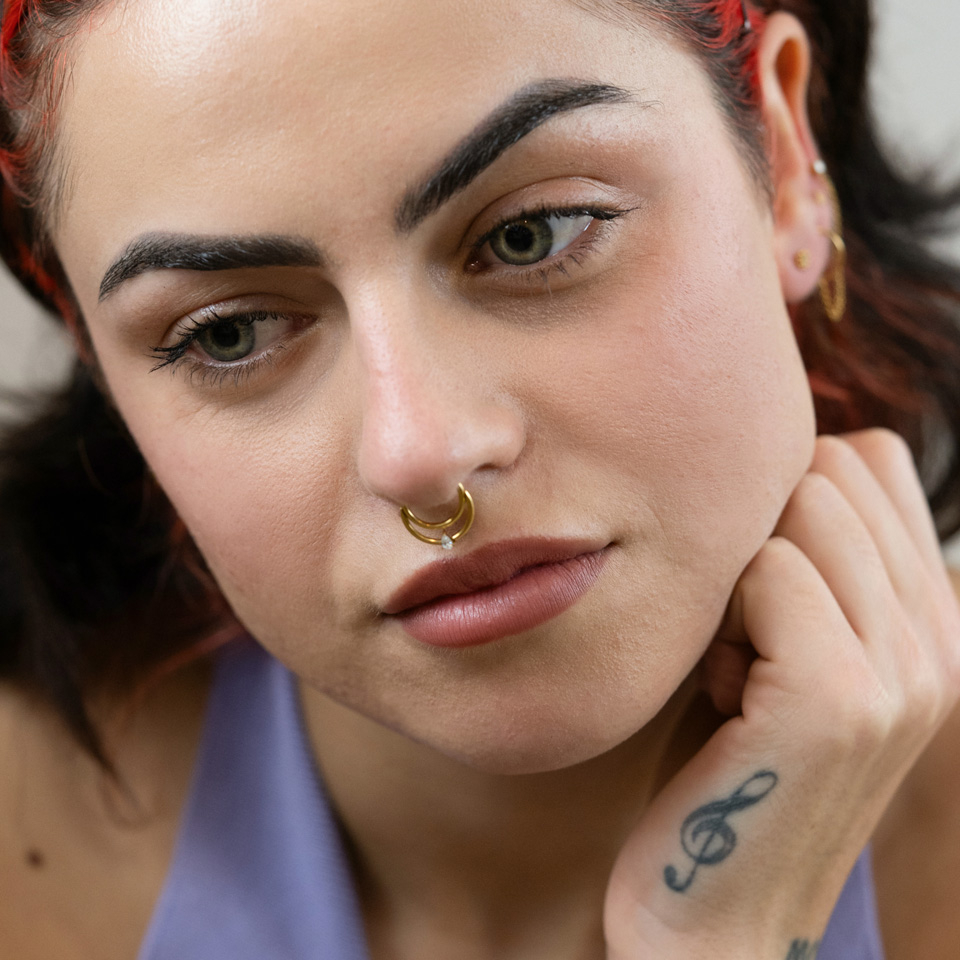 Segmentring i titan med dråpesten med en balansert design med 2 bøyler. Dette vakre smykket oser av klasse og eleganse med en tidløs dråpesten som forbinder de to ringene som gir smykket sitt særpreg. Det er tilgjengelig i både gull- og sølvfarger. Smykket har en trådtykkelse på 1,2 mm og kommer i 8 mm og og en ringdiameter på 10 mm , noe som gjør dette smykket perfekt for en helix, en daith eller en septumpiercing.