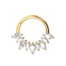 Denne vakre ringen har 9 marquiseslipte CZ-steiner i et mønster med vekslende størrelser mellom små og store. Smykket er ideelt for piercinger der du ønsker designet på forsiden av ringen i stedet for på siden, som for septum eller daith. Den har et hengsel, som gjør det enkel å sette inn piercingen, og er laget av titan, noe som gjør den godt egnet for sensitiv hud.
