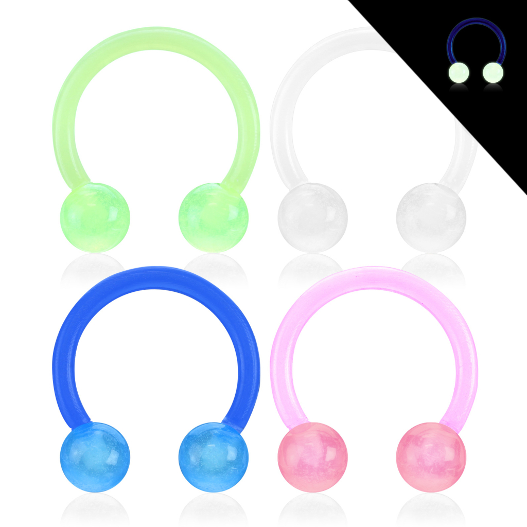 Hvis vi slukket lyset, så ville hesteskoen på bildet ovenfor lyse opo. Du kikker nemlig på en selvlysende hestesko, som er laget av akryl. I dagslyset ligner denne hesteskoen kanskje bare en helt vanlig hestesko, men når mørket faller på, så vil hesteskoen lyse. Dette gjør smykket perfekt til fester med massevis av farger. Hesteskoen her kan brukes flere steder på kroppen, alt etter hvor du er piercet - så lenge målene på smykket stemmer overens med målene på din piercing. Smykket brukes ofte som en septumpiercing, men det kan også brukes som en øyenbryns- og ørepiercing, så valget er helt opp til deg.