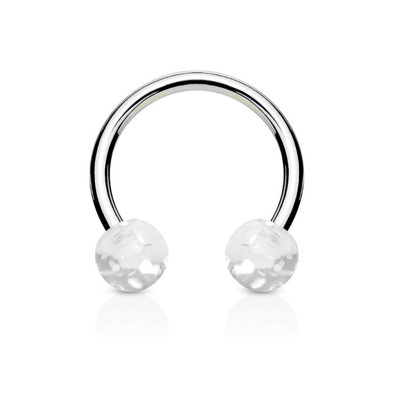 Hesteskoen er utstyrt med to akrylkuler som er lett farget i den fargen som glitterflakene også har. De små glitterflakene er med på å gi smykket en unik look, og gjør at smykket ikke ligner alle andre.