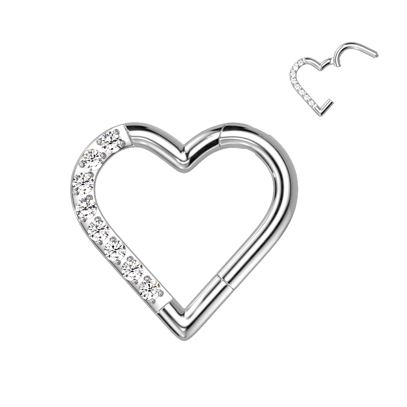 Hjerteformet ørepiercing av titan med innfattede stener