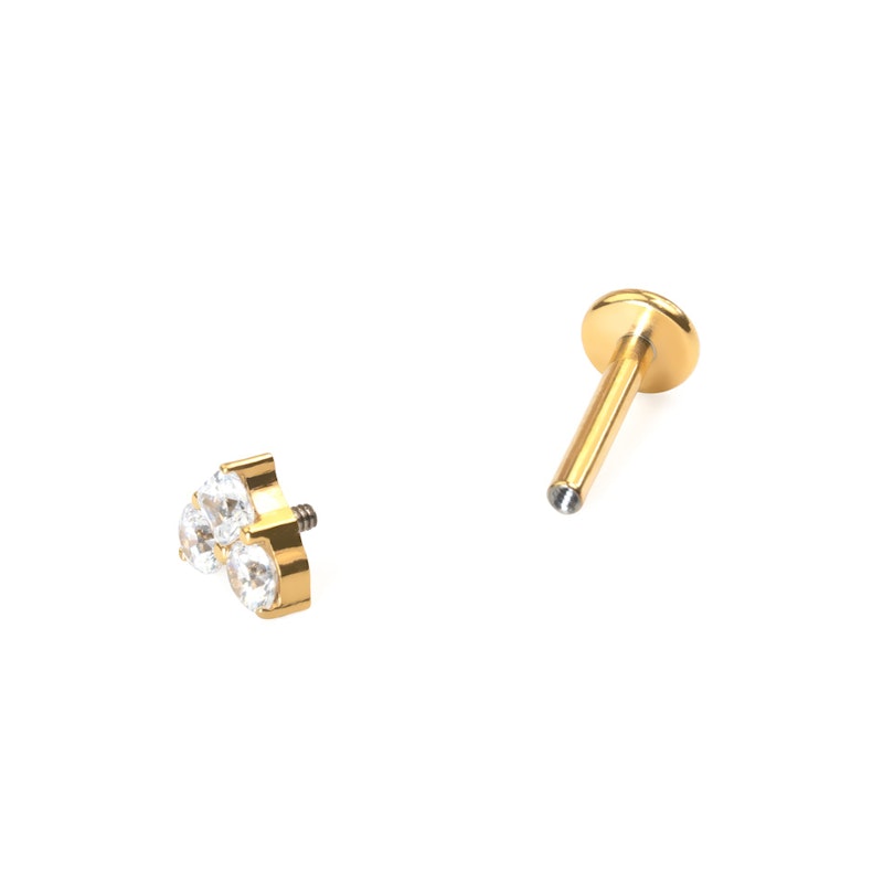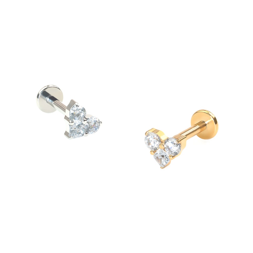 Denne titanlabreten er utstyrt med 3 CZ-stener arrangert i en hjerteform. De øverste to stenene er runde og den nederste firkantet. Den er innvendig gjenget og kommer med valg av gull- eller sølvfinisher. Dette søte passer seg godt ut i en rekke ørepiercinger. Målet på det bredeste er 5 mm. Den flate baksiden forsikrer komfortabel bruk.