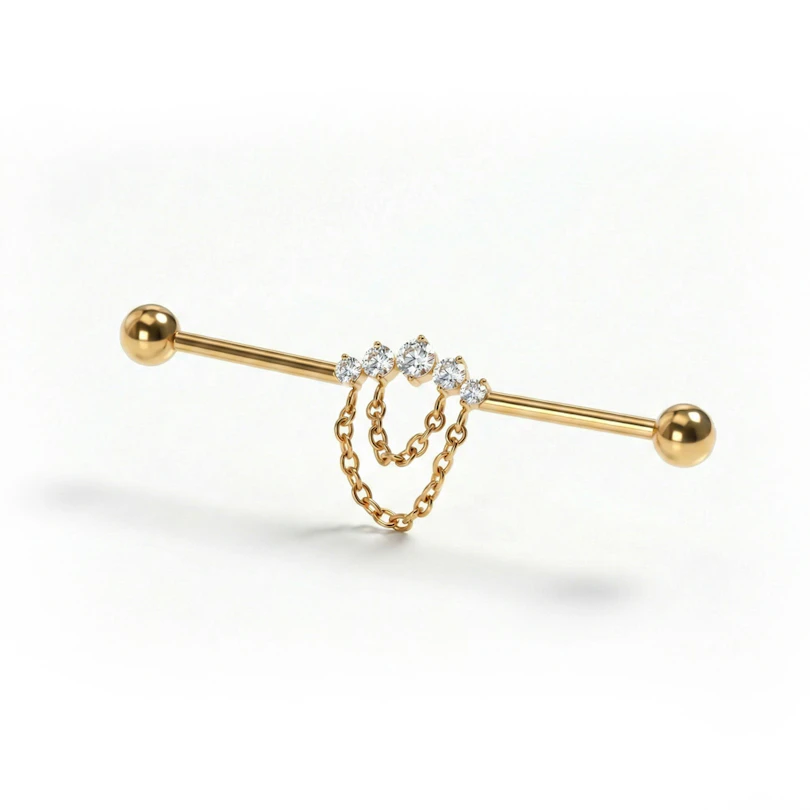 Dette er en industrial barbell i titan, dekorert med glitrende steiner og delikate kjeder som gir en moderne vri på den klassiske silhuetten. Langs staven er det plassert små steiner forbundet med tynne, lagdelte kjeder – et design som føles sofistikert og kontrollert. Smykket er iøynefallende uten å bli for prangende, og passer perfekt for deg som ønsker en subtil variasjon i din piercing-look. Tilgjengelig i fargene gull og sølv.