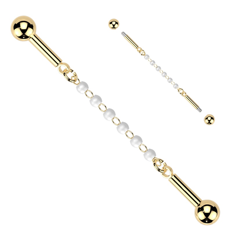 Denne Industrial barbellen med perlekjede gir industrial-formen en soft touch. En rekke små, perleaktige kuler i en rekke, koblet sammen med tynne kjedeledd som gir barbellen en mer prydet look. Kommer i gull- og sølvfarger, og er et smykke du velger når du vil ha noe annet enn den vanlige rette barbellen.