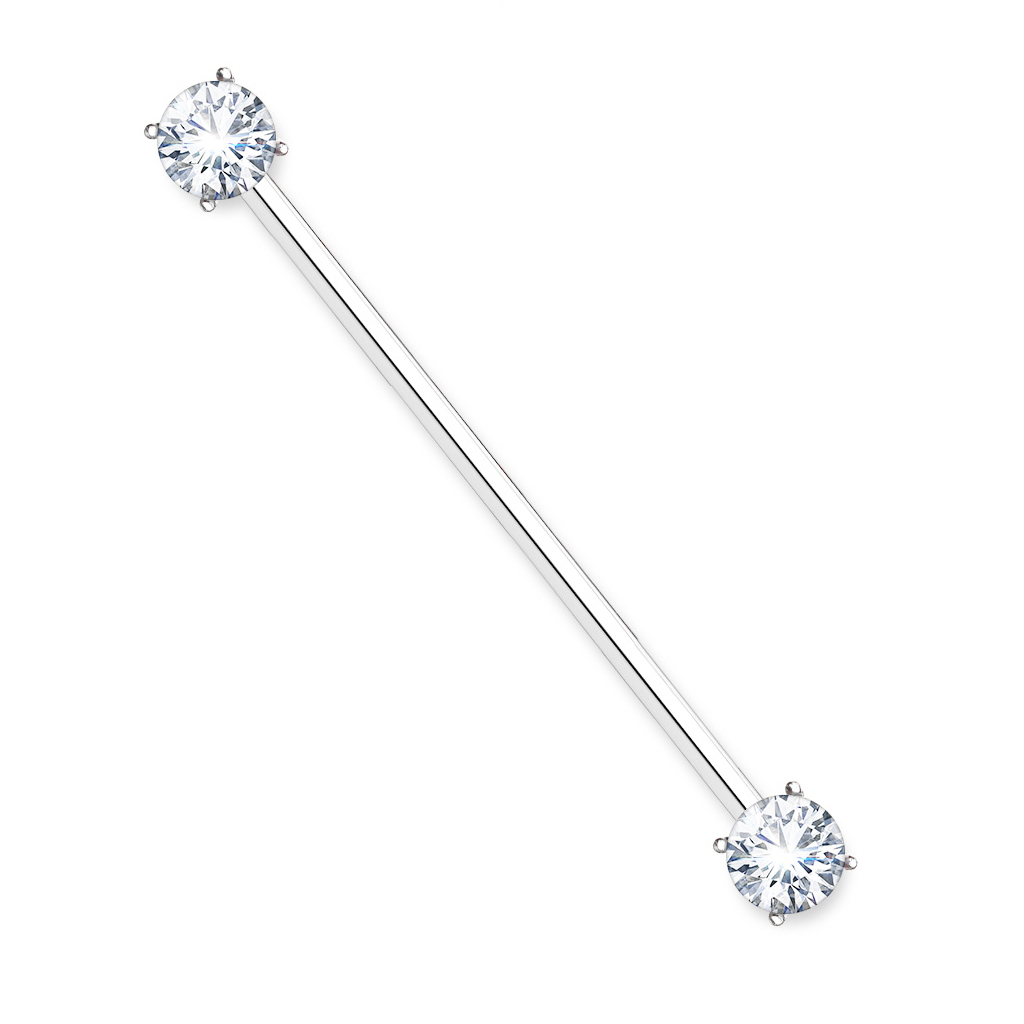 På bildet ovenfor finner du en av de mer elegante industrial staver. Dette smykket er laget av kirurgisk stål, hvor det sitter to klare glitrende stener i hver ende av smykket. Stenene i smykker har fått en rund form og sitter innkapslet i en form for skål. Skålen har samme farge som den du velger til staven. Skålen har fire armer som går opp langs siden av stenene og en smule over for å holde dem fast.