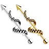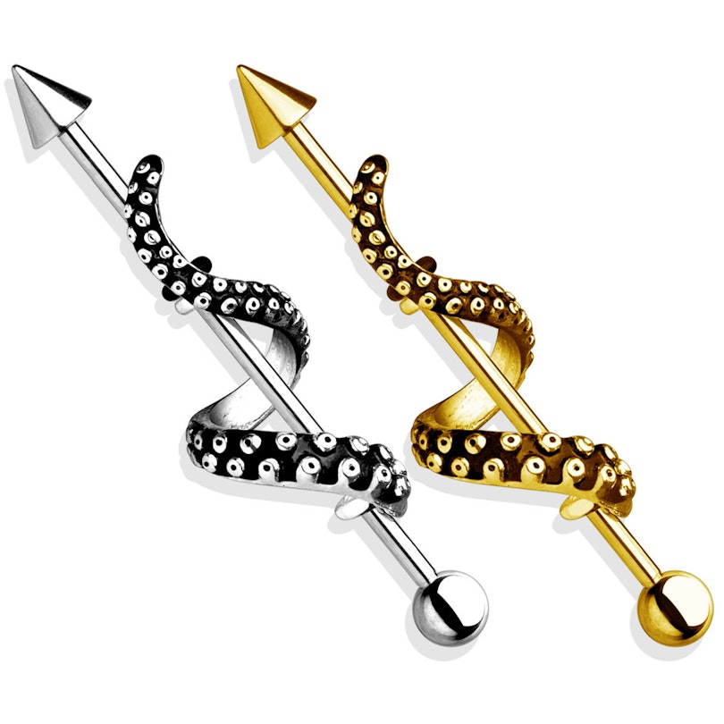 Hvis du leter etter noe helt unikt og flott til din industrielle piercing, så har du landet på rett sted! Denne stilige industrielle staven er formet som en pil, med en spiss i den ene enden og en kule i den andre. Det er det midterste delen, mellom de to piercinghullene som er den mest interessante delen her. For her finner du nemlig en virkelig flott og meget livaktig blekksprut-tentakkel. Tentakkelen er sort i bunnen og dekorert med små sugekopper fra ende til ende.
