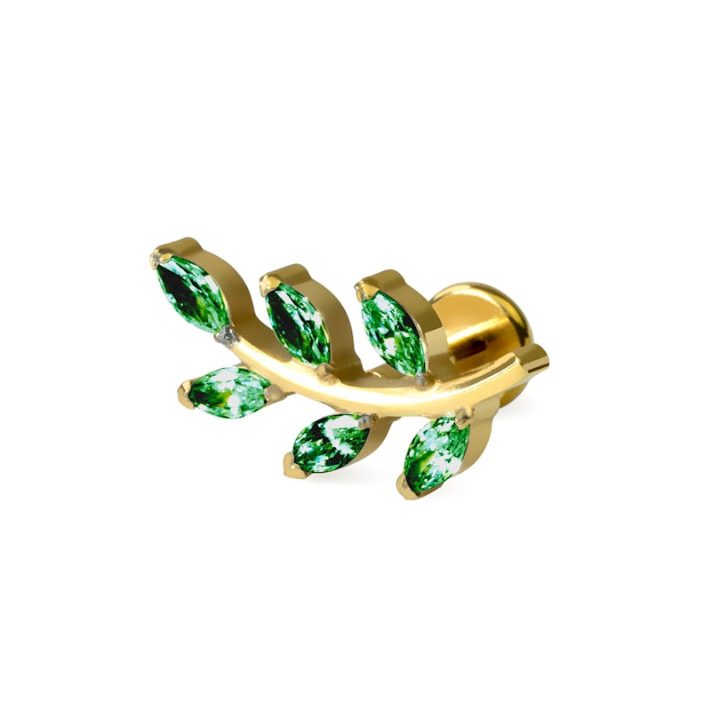 En vakker enestående labret i form av et blad. med 6 delikate marquiseslipte stener. Tilgjengelig med fasjonable grønne eller gjennomsiktige stener, og kommer også i variantene gull- eller sølvfinnisher. Disse er definitivt noe som bør vurderes å ha i samlingen din.