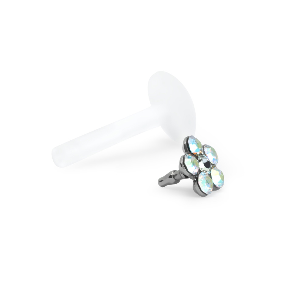 Flott labret med en formasjon av små skinnende stener som tilsammen former en blomst, til deg som gjerne vil gjøre litt ekstra ut av ditt smykkevalg. De fleste labretter består som regel kun av en enkelt liten kule eller sten, så denne her skiller seg virkelig ut med alle de 6 små stenene som danner blomsten.