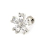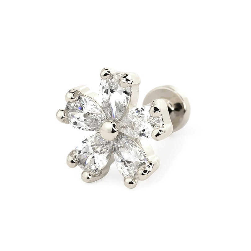 Blomsten er laget av messing og belagt for å matche resten av labreten. Du kan nemlig få smykket i flere forskjellige farger og med forskjellig belegg avhengig av hva slags kombinasjon du ønsker deg. Hvis du for eksempel velger en rosegull labret - da kommer blomsten til å være i rosegull. Imidlertid vil stenene alltid være klare.